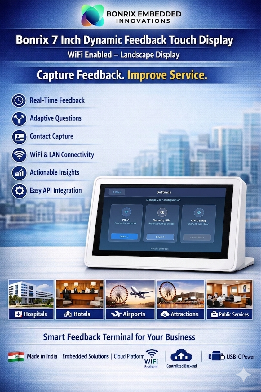 At Bonrix Embedded Innovations, Ahmedabad, Gujarat, India, we proudly present the Bonrix 7 Inch Dynamic Feedback Touch Display β WiFi Enabled (Landscape Display) β a smart, interactive solution designed to transform how organizations collect and act on real-time feedback.