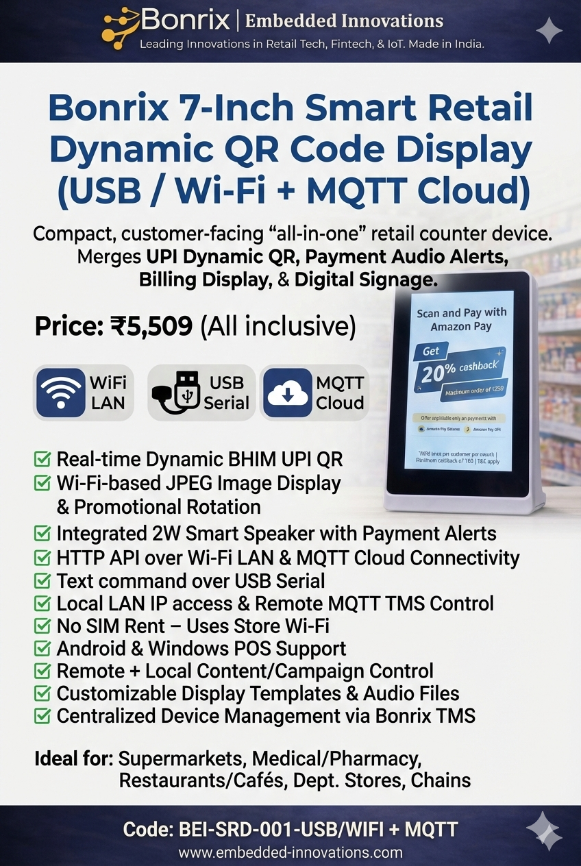 Transform your retail experience with Bonrix Embedded Innovations' cutting-edge 7-inch display! Designed as the ultimate customer-facing hub, this sleek portrait-orientation device combines Dynamic QR payments and digital signage in one powerful solution. Perfect for tabletops, counters, or kiosks, it streamlines transactions while captivating customers.