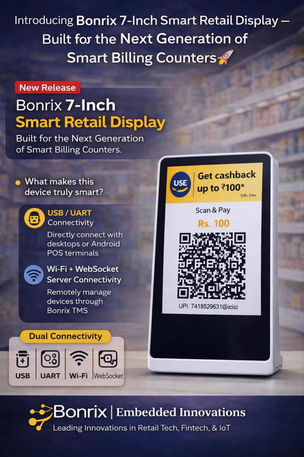Transform your retail experience with Bonrix Embedded Innovations' cutting-edge 7-inch display! Designed as the ultimate customer-facing hub, this sleek portrait-orientation device combines Dynamic QR payments and digital signage in one powerful solution. Perfect for tabletops, counters, or kiosks, it streamlines transactions while captivating customers.