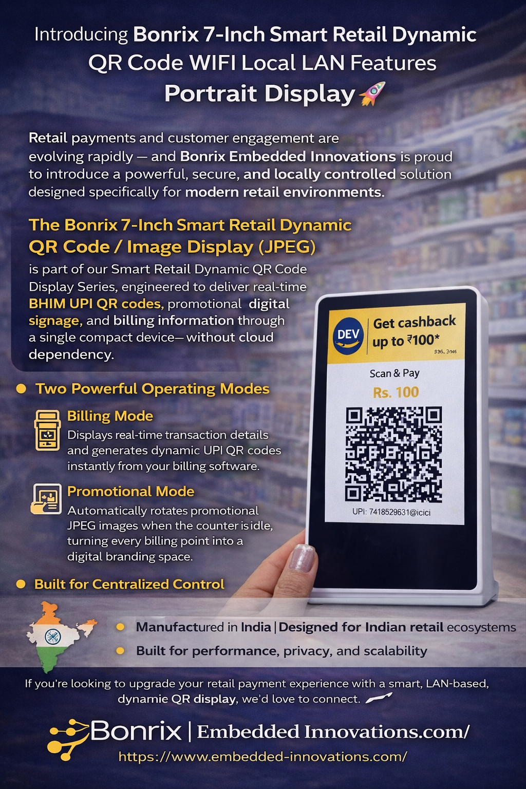 Transform your retail experience with Bonrix Embedded Innovations' cutting-edge 7-inch display! Designed as the ultimate customer-facing hub, this sleek portrait-orientation device combines Dynamic QR payments and digital signage in one powerful solution. Perfect for tabletops, counters, or kiosks, it streamlines transactions while captivating customers.